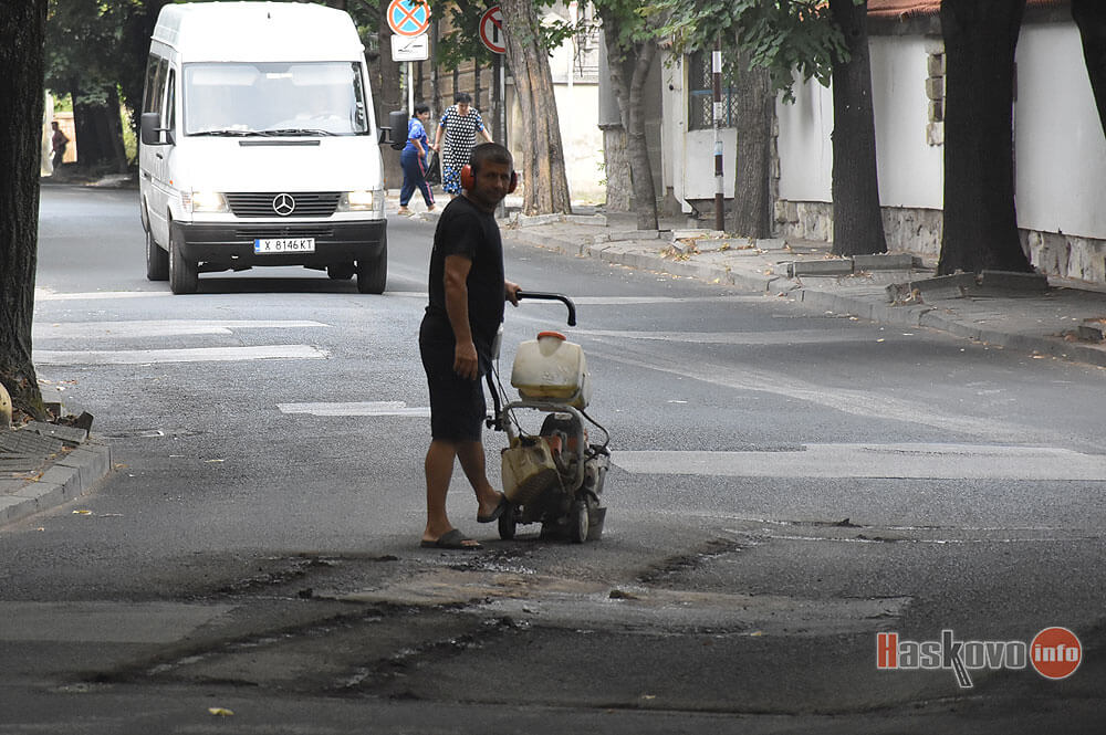 Работници изкърпват дупките по улица „Цар Освободител“ в Хасково. По-късно шофьори се жалваха, че асфалтът е изрязан много дълбоко, а мястото е оставено необезопасено, което е предпоставка за произшествия.