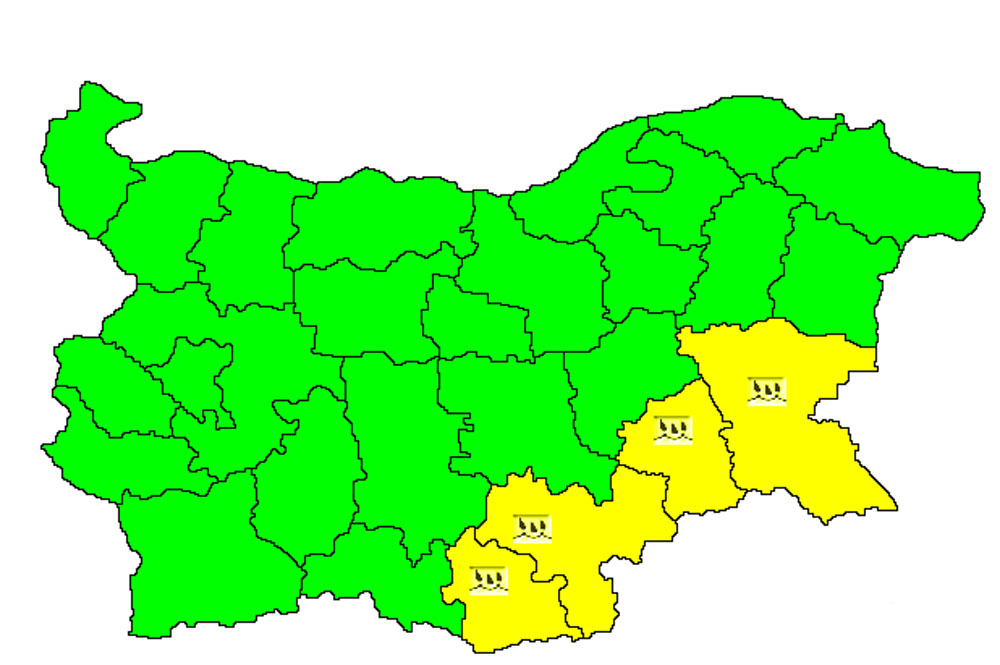Предупреждението е в сила още за областите Кърджали, Ямбол и Бургас. От събота започва подобрение на времето с максимални температури до 36 градуса.