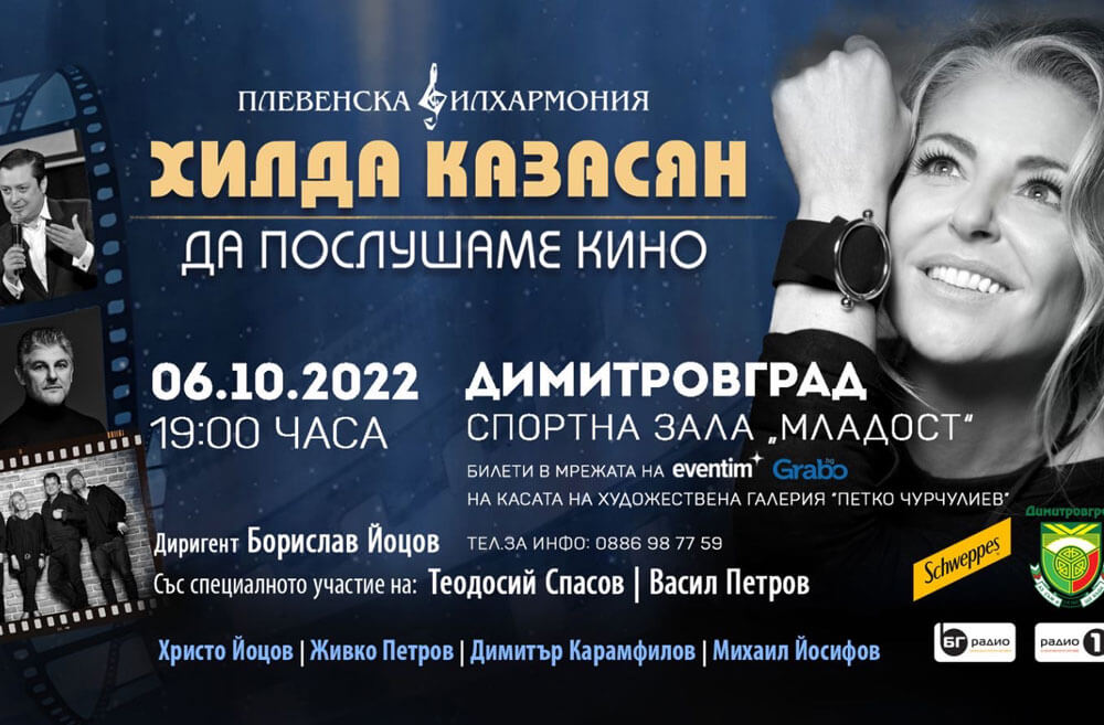 Хилда Казасян, Теодосий Спасов и Васил Петров ще представят „Светът на киното в музиката“ заедно с Плевенската филхармония под диригентството на Борислав Йоцов на 6 октомври в спортна зала „Младост“ в Димитровград, съобщават от общината.