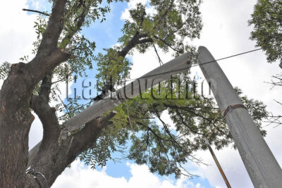 При падането си дървото е ударило стълба, половината от който лежи върху друго дърво на тротоара. Кабелите също са много ниско до преминаващите хора.
