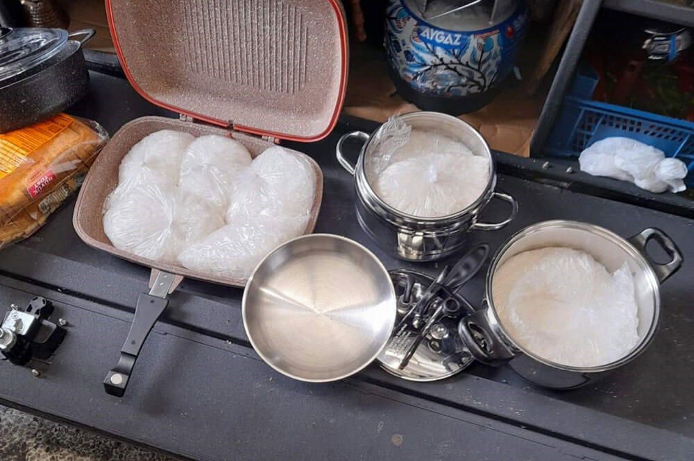 ДрогаПо метода „анализ на риска“ камионът е селектиран за щателна митническа проверка. В долапа на полуремаркето, който често се използва от водачите за съхранение на храна и посуда, в две тенджери, грил тиган и черна полиетиленова торба, митничарите открили девет прозрачни плика, съдържащи бяло кристално вещество.