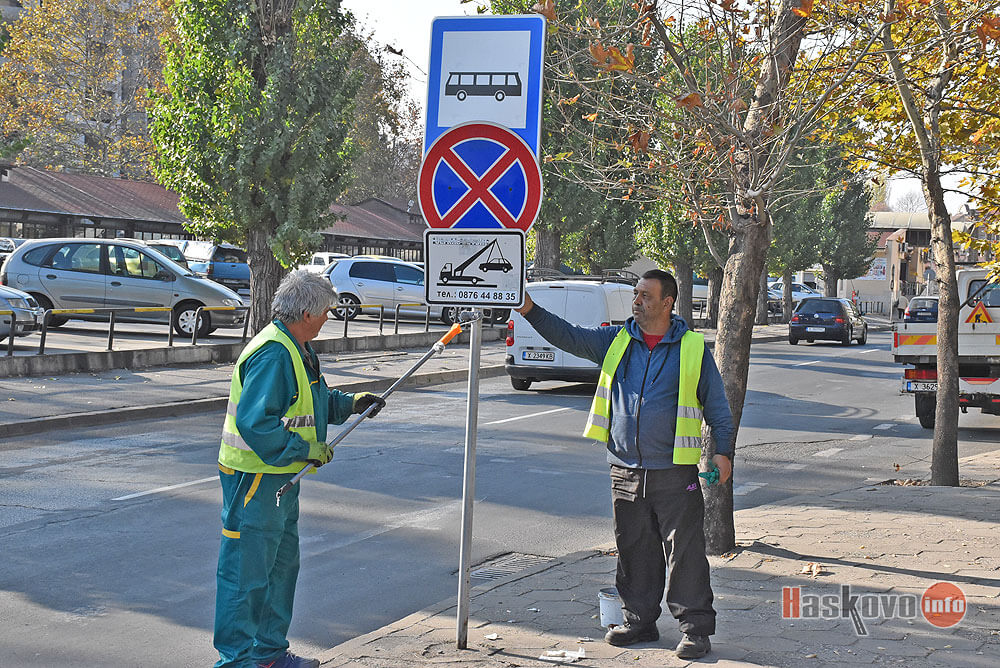 Работници от „Екопрогрес“ почистват и боядисват стълбовете на пътните знаци в Хасково.