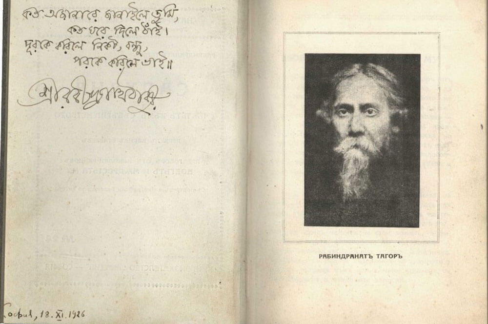 Специален интерес представлява екземпляр от книгата на Рабиндранат Тагор „Садхана: Пътят към съвършенството“ в превод на български език, която носи посвещение и автограф от Нобеловия лауреат за литература. Индийският писател и философ, композитор, художник и общественик Рабиндранат Тагор (1861-1941) идва в София в края на 1926 г. Дни наред вестниците анонсират новината за гостуването му. Университетът и училищата са затворени за два дни, за да могат младите хора да се докоснат до този „цар на мъдростта“ и „духовен княз на Индия“.