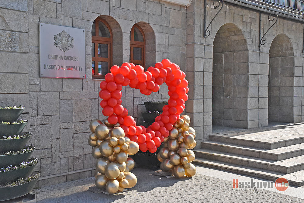 Червено сърце от балони за снимки на влюбените е поставено пред Община Хасково на Свети Валентин.