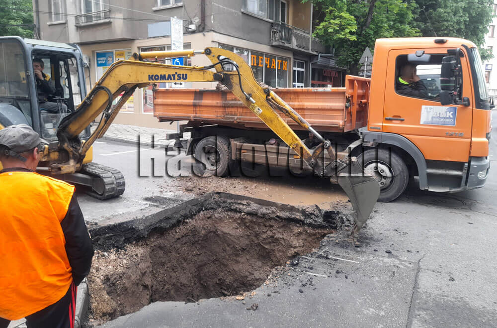 Екип на ВиК разкопа асфалта до съдебната палата в Хасково за отстраняването на двойна авария.