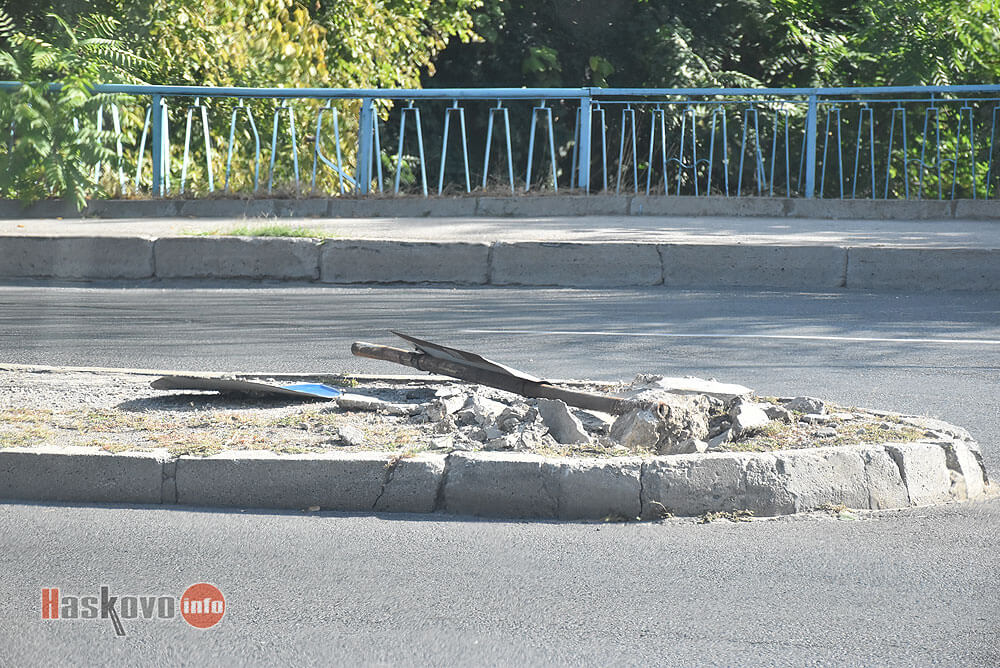 Автомобил е съборил пътни знаци на кръстовището между булевардите „България“ и „Васил Левски“ до бившата Захарна фабрика в Хасково.
