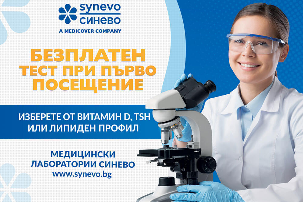 Възползвайте се сега, само в медицинска лаборатория Синево, и вземете един от тези три теста напълно безплатно с вашата първа поръчка! Промоцията е валидна до 15 октомври. Вижте в кои локации е валидна кампанията тук – https://www.synevo.bg/bezplaten-test-pri-parvo-poseshtenie/