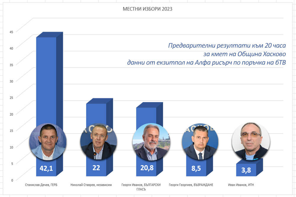 Трима от кандидатите за кмет на Хасково имат шанс за балотаж следващата неделя, сочат първите данни от екзитпол на агенция Алфа рисърч по поръчка на бТВ.