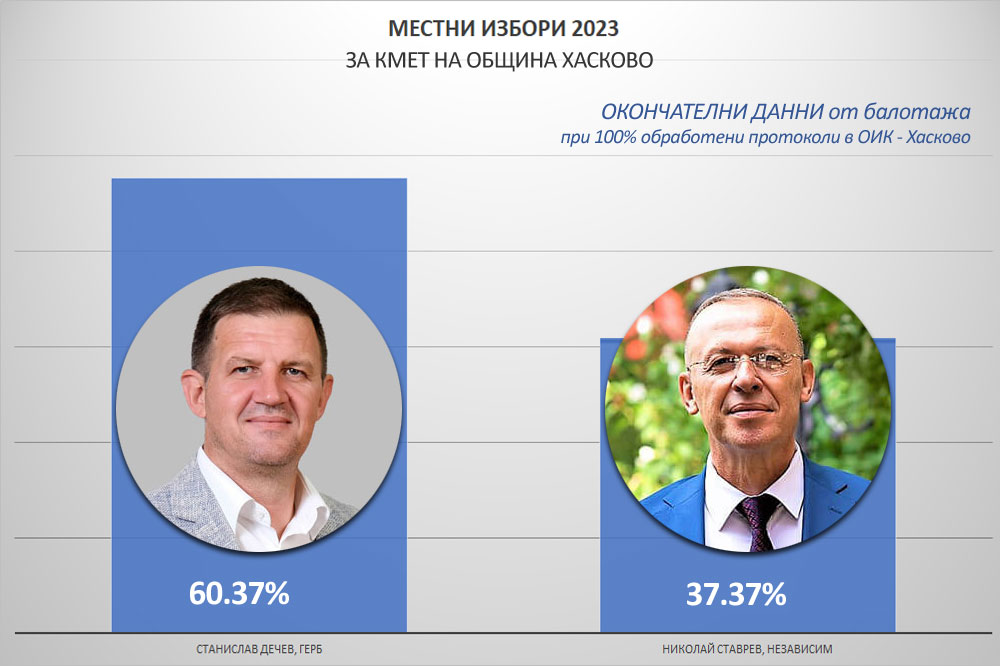 При 100% обработени протоколи от СИК досегашният кмет на община Хасково Станислав Дечев (ГЕРБ) печели балотажа с 60.37%.