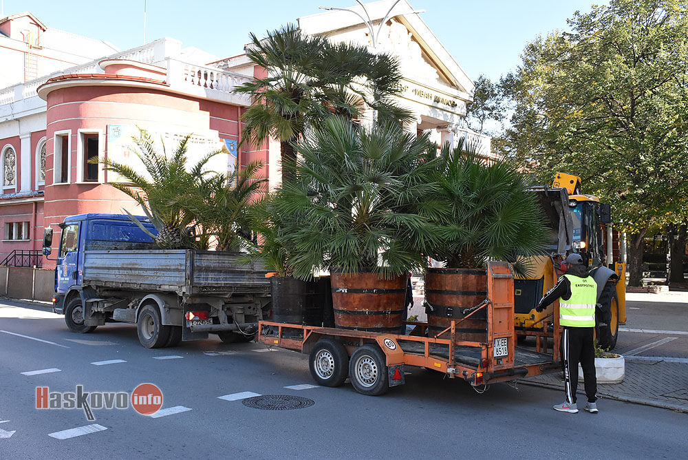 Работници на „Екопрогрес“ прибират за зимата палмите и останалите екзотични растения от центъра на Хасково.