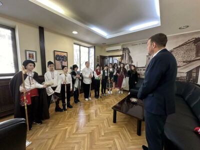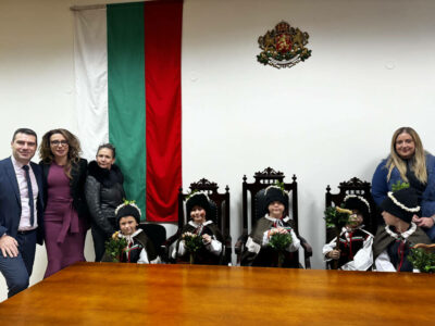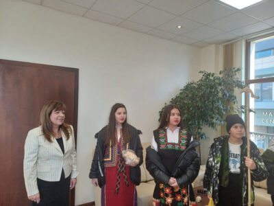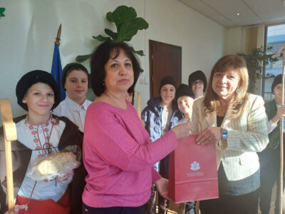Райчева посрещна радушно петокласниците. Децата изпяха традиционни за Игнажден фолклорни песни и дадоха питка за здраве на областния управител и екипа му.