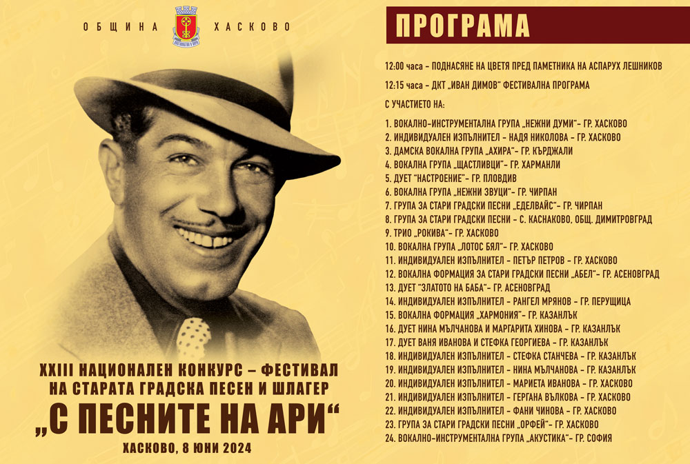 23-ото издание на Националния конкурс-фестивал на старата градска песен и шлагер „С песните на Ари“ ще се проведе на 8 юни в Хасково, съобщават от общината.