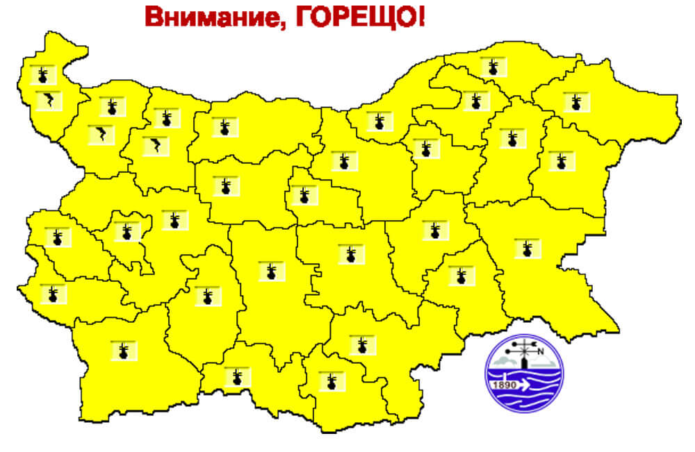 Жълт код за високи температури е обявен за цялата страна от Националния институт по метеорология и хидрология.