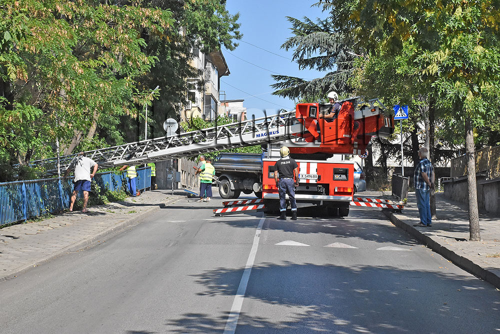 Причината е санитарна сеч на опасно надвиснали дървета и клони в района зад Младежкия център. За изсичането им се използва пожарникарската стълба.