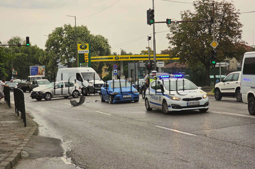 Пътният инцидент стана при светофара до ветеринарната лечебница. По първоначална информация едната кола е преминала на червен сигнал и това е довело до сблъсъка с другия автомобил.