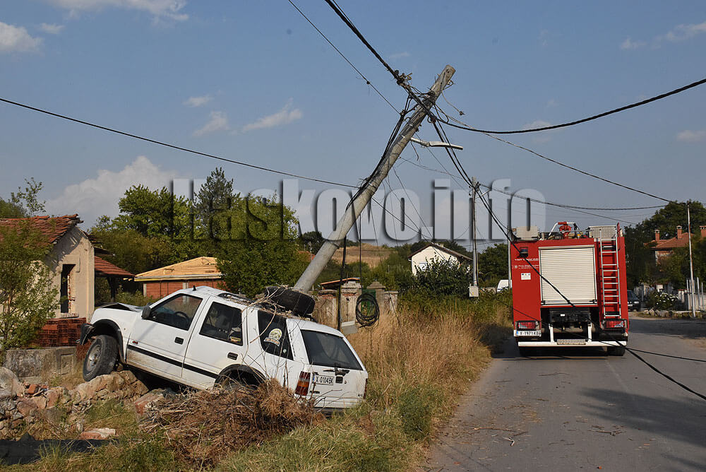 Инцидентът е станал на главната улица. Колата се е ударила в ограда и стълб, който е силно наклонен и част от кабелите от него са паднали на земята.