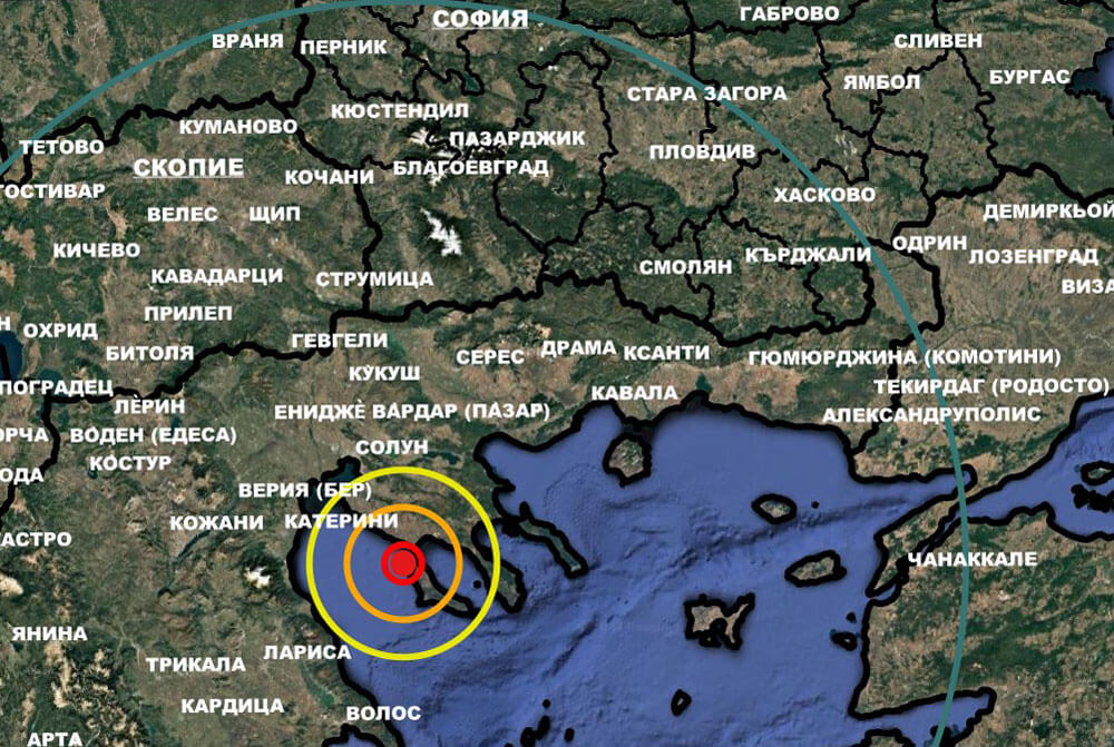 То е с епицентър на 61 км от град Солун (Гърция), на 130 км от град Петрич и на 283 км от град София.