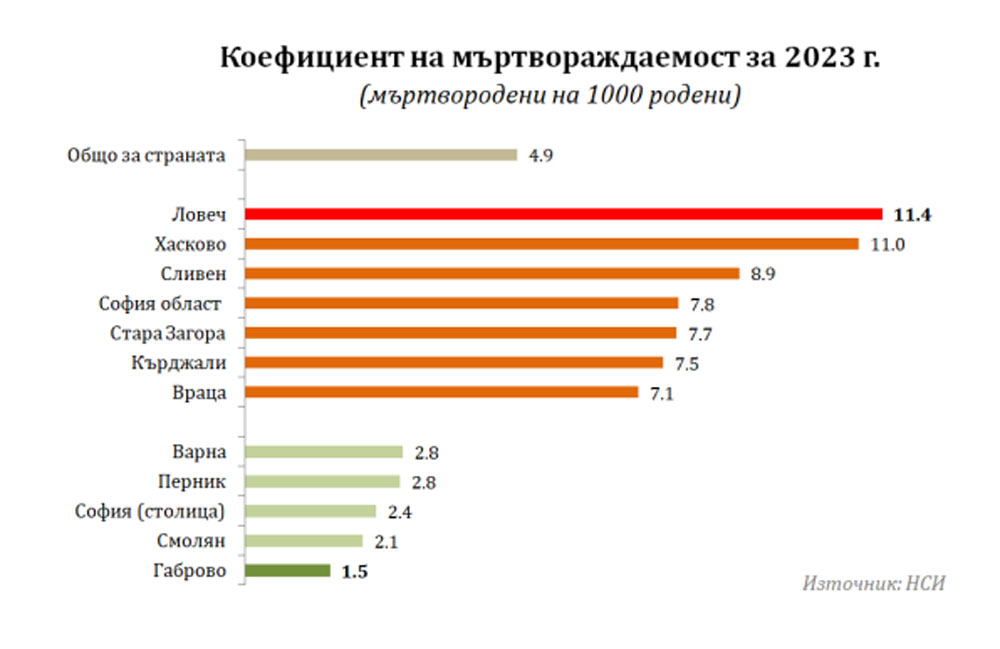 Коефициентът в Хасково е 11 мъртвородени на 1000 родени деца, а в Ловеч е 11.4. Общо за страната той е 4.9.