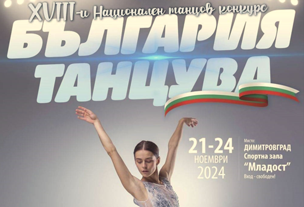 XVIII-то издание на Националния танцов конкурс за театрално-сценични танци – класически балет, характерни и съвременни танци „България танцува`2024“ ще се проведе от 21 до 24 ноември в спортна зала „Младост“ в Димитровград, съобщават от общината.