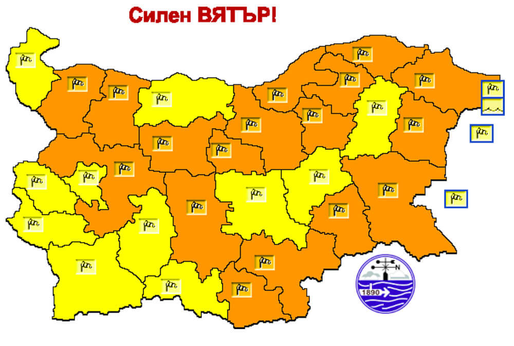 За останалите общини в региона е издаден жълт код, като скоростта на вятъра ще е до 90 км/ч.
