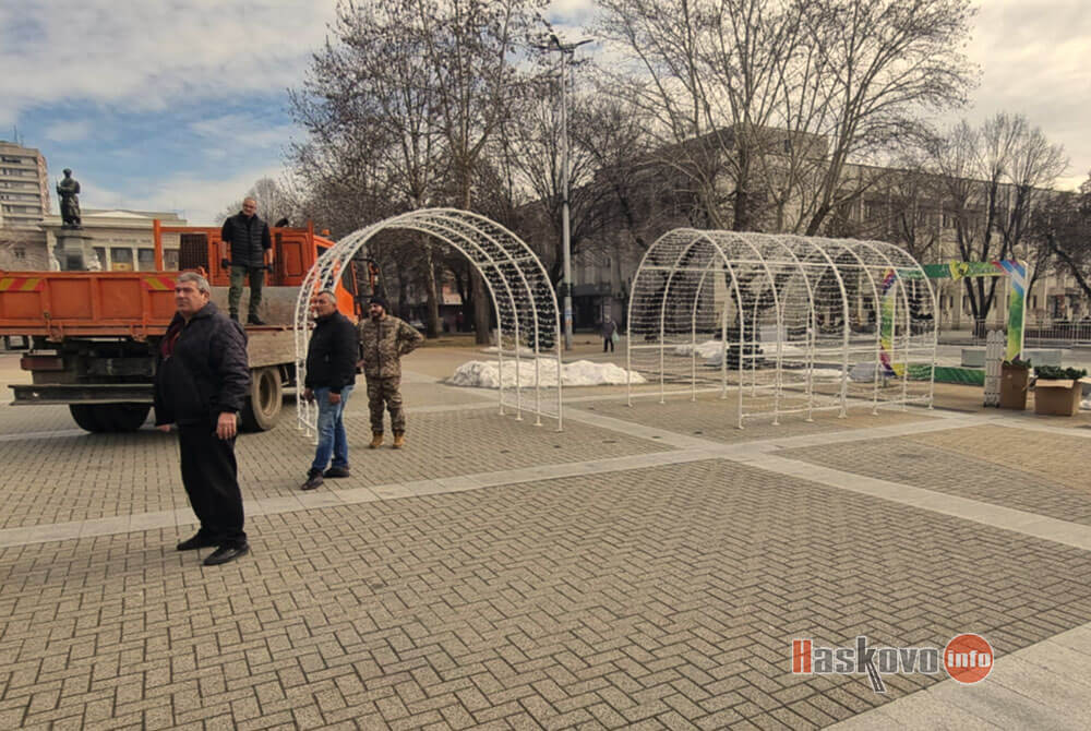 Работници демонтираха звездния тунел от коледно-новогодишната украса в центъра на Хасково. 8-метровото съоръжение беше монтирано за пръв път за празниците.