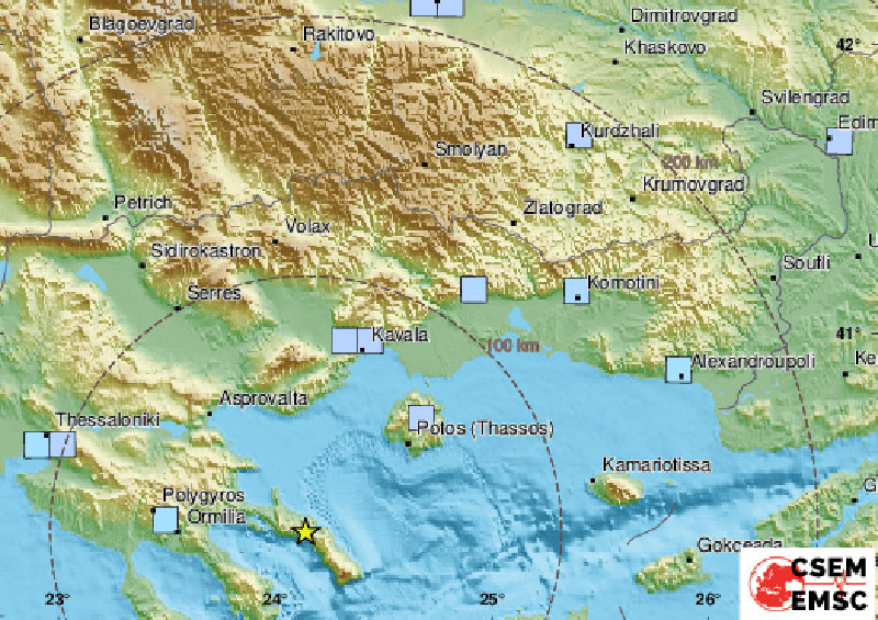 Трусът е в Егейско море и е регистриран в 18:11 часа. Земетресението е с дълбочина 5 километра и е на 109 километра източно от Солун, съобщават от европейския сеизмологичен център.