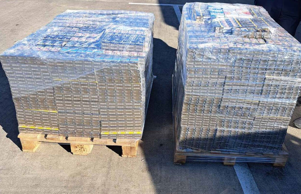При последвалата физическа проверка във вътрешността на пластмасовите дъна на палетите с авточасти са открити 10 450 кутии цигари без български акцизен бандерол.
