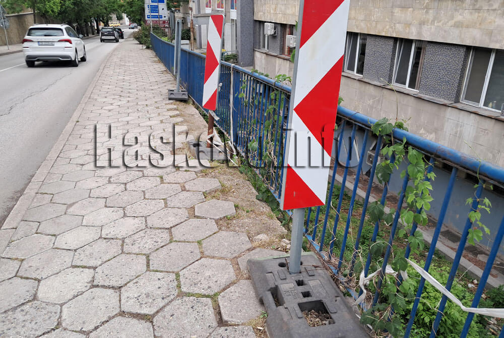 Тротоарът там е обезопасен със знаци заради пропадане.