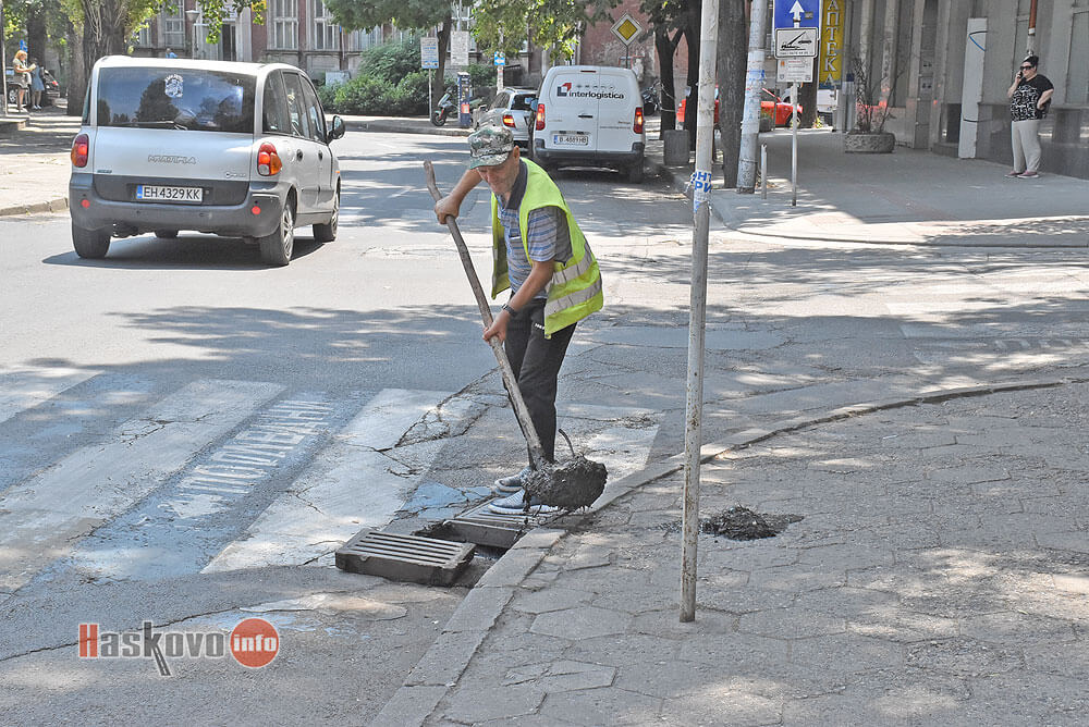 Работници на „Екопрогрес“ почистват шахти по булевард „България“ в центъра на Хасково.