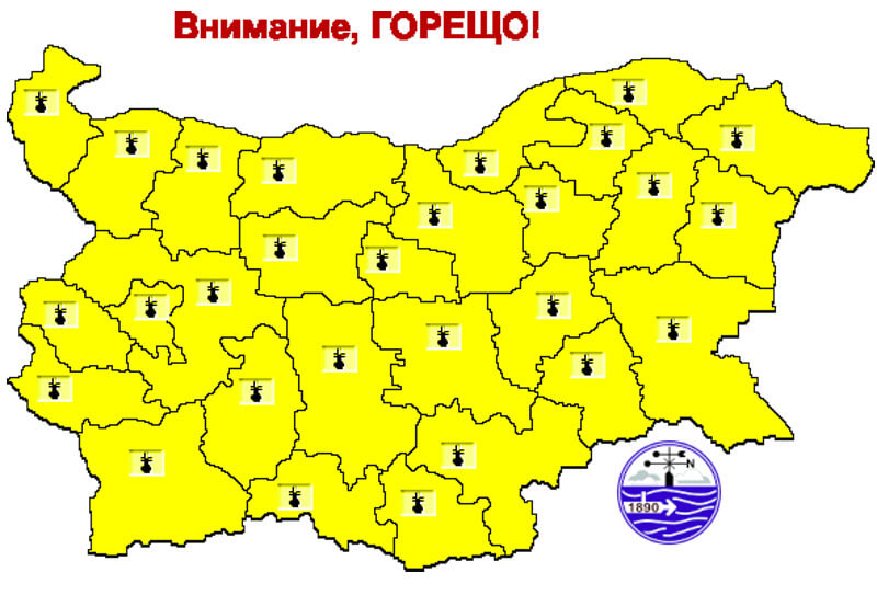 Жълт код за опасно високи температури е обявен за понеделник за цялата страна от Националния институт по метеорология и хидрология.