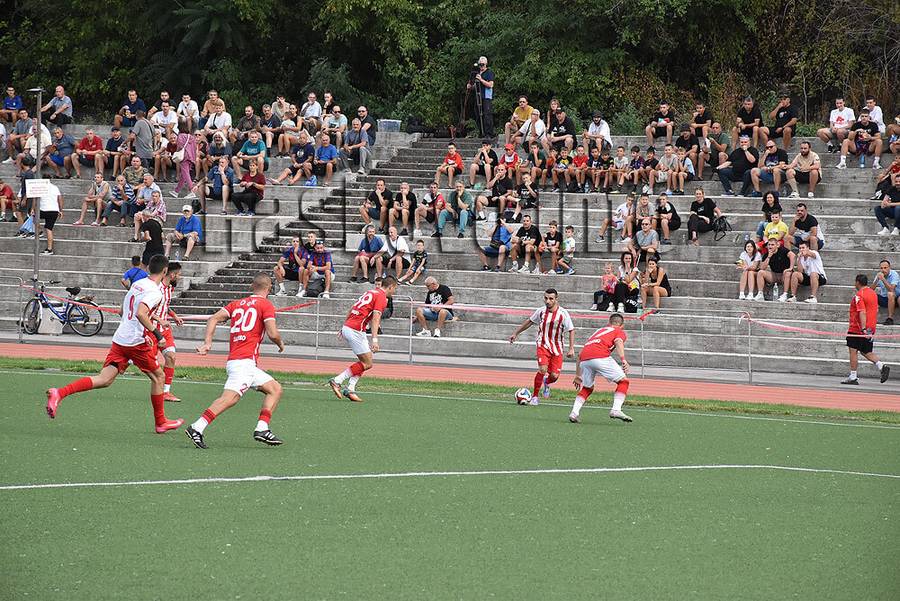 Първото полувреме на градското дерби, което събра доста зрители по трибуните, завърши 1:1. В 17 минута за ОФК откри Мирослав Илиев, но в 36 минута равенството възстанови Ерен Емин.