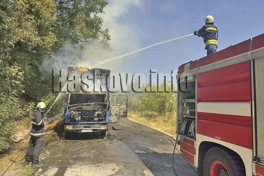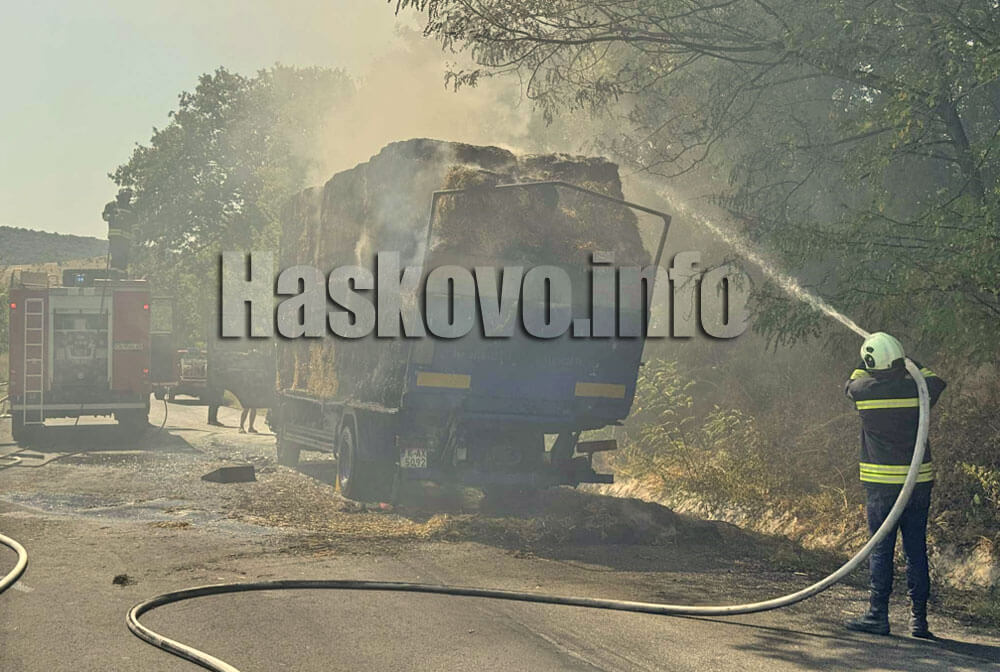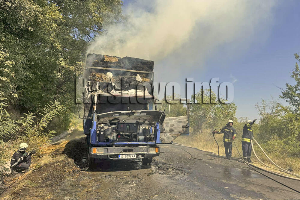 Товарният автомобил със слама се е запалил в ранния следобед в отсечката между селата Маслиново и Мост. На място се е образувала колона от чакащи да преминат коли.