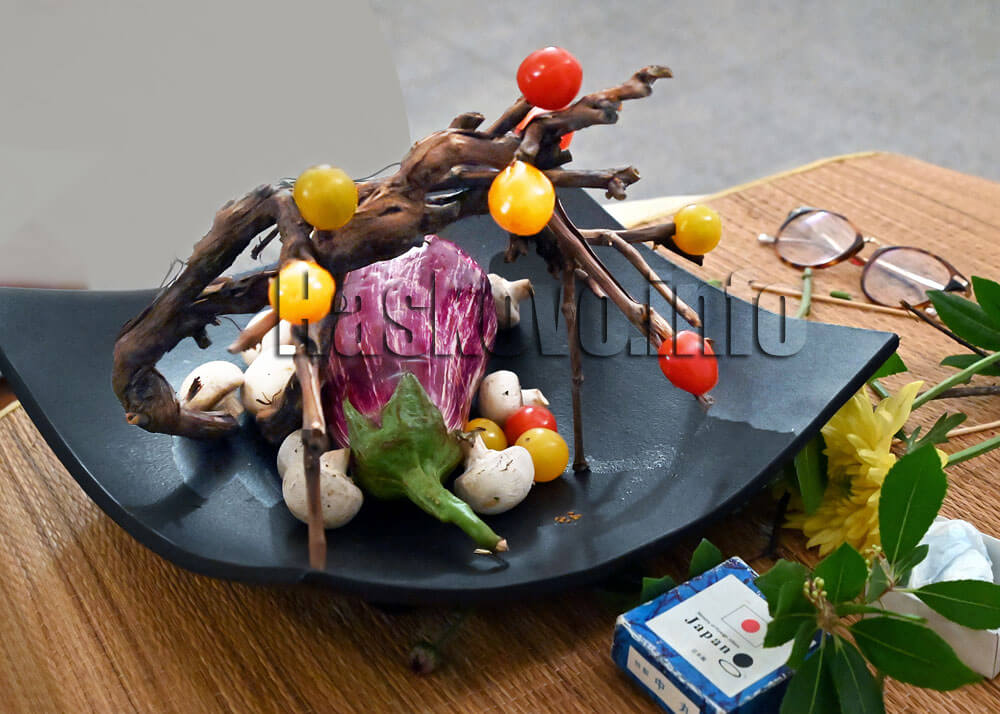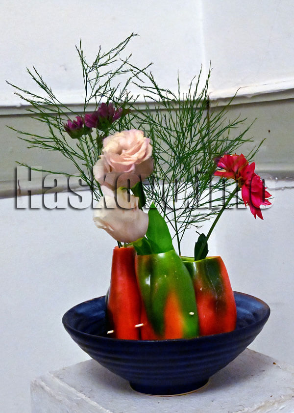 Интересно бе да се види композицията от патладжан, чери домати и гъби, а също лозови пръчки. Чушки капия, съединени с дървени шишчета пък се превърнаха в оригинални вази за рози и хризантеми – илюстрация, че в икебана могат да се използват всички естествени материали.