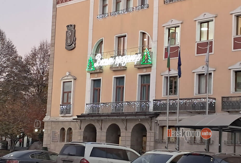 Надпис "Весели празници!" светна от фасадата на Община Хасково.