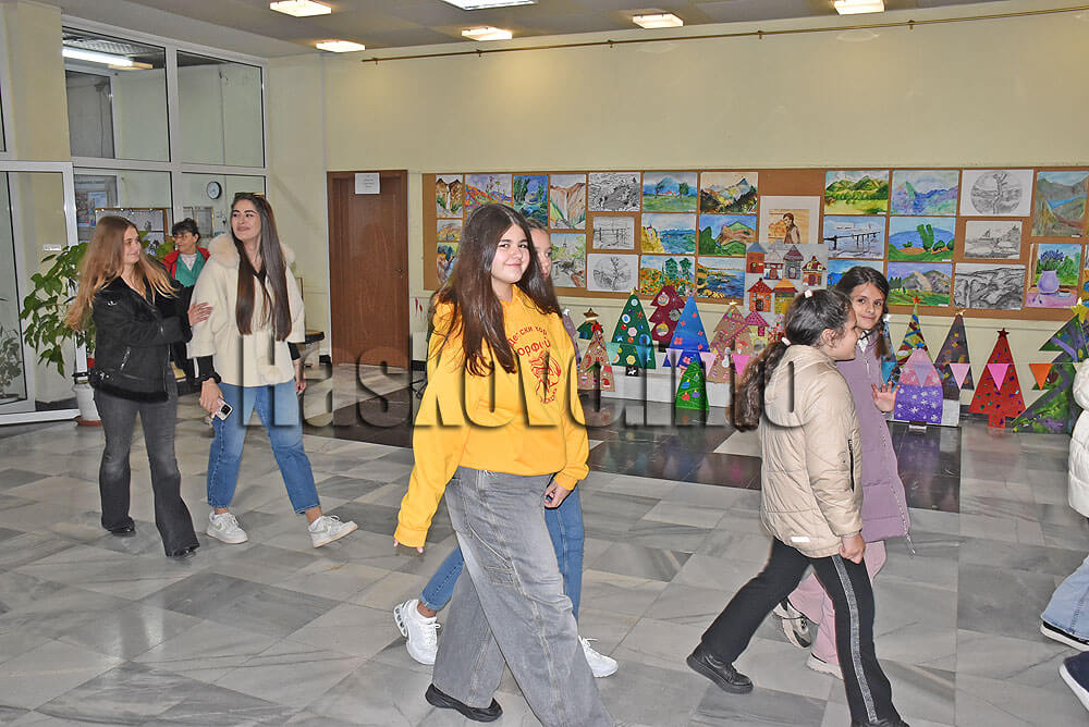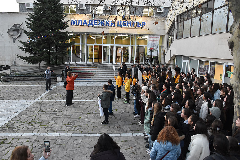 Младите певци тръгнаха от Бизнесцентъра и стигнаха до Младежкия център, където започнаха първите им сценични изяви. В началото всички изпълниха химна на фестивала „Коледа пристига“.