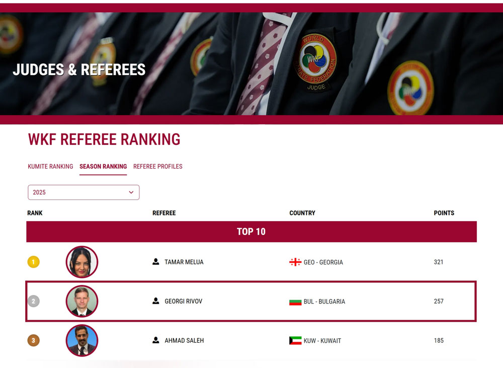 След завършване на състезанията от календара на Световната карате федерация – World Karate Federation, излезе ранглистата за представянето на реферите за 2025 г.