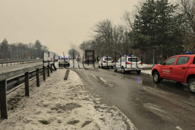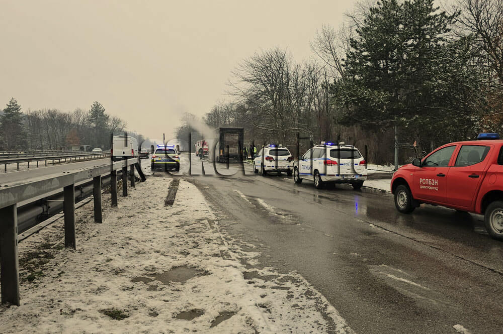 Товарният автомобил е в отбивката и движението не е затворено. Предстои прехвърлянето на животните в друг камион.