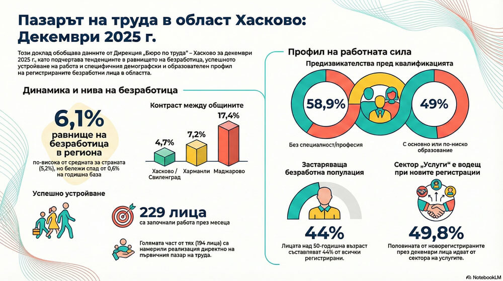 5 052 са регистрираните безработни към 31 декември 2025 г. в Хасковска област, съобщават от дирекция „Бюро по труда“.