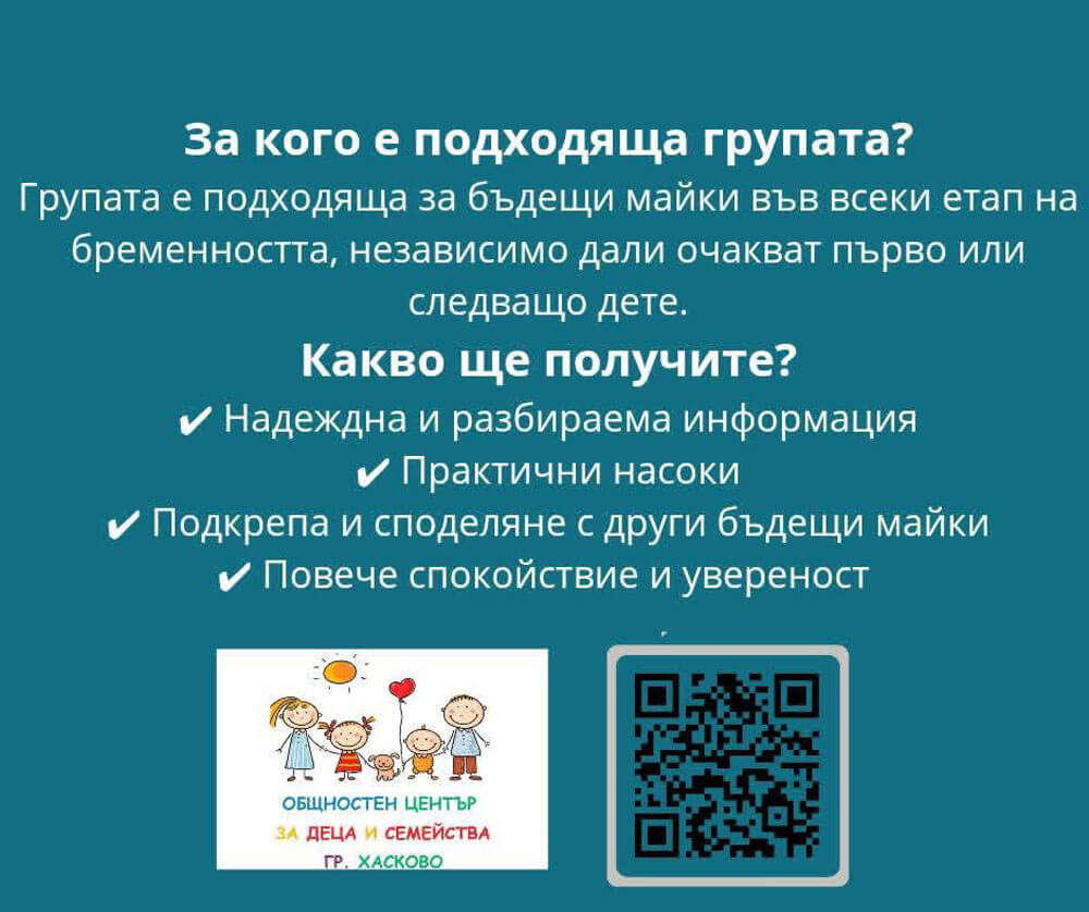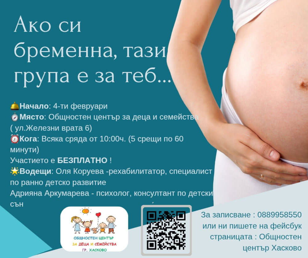 Безплатна група за бъдещи майки, насочена към жени във всеки етап на бременността, започва на 4 февруари от 10 часа в Общностен център за деца и семейства на улица „Железни врата“ №6 в Хасково.