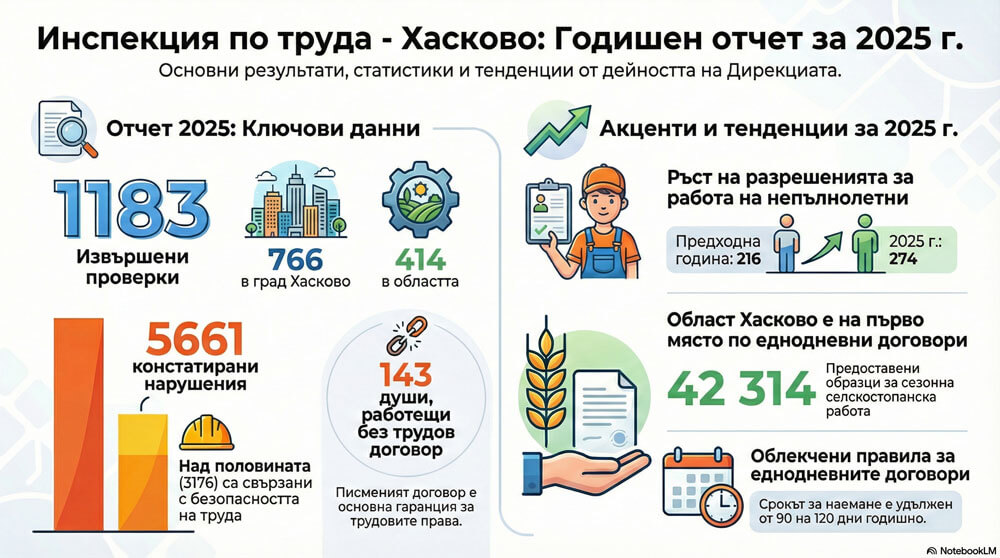 Инспекция по трудаПрез 2025 г. са предоставени 42 314 образци на еднодневни трудови договора. Областта е на първо място по този показател в страната. В сравнение с предходната година еднодневните трудови договори се увеличават със 17 529.