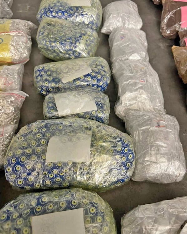 При последвалата физическа проверка, в единия от шкафовете на полуремаркето и на множество различни места в шофьорската кабина, са открити общо 39 полиетиленови пакета, съдържащи изделия от жълт и бял метал.