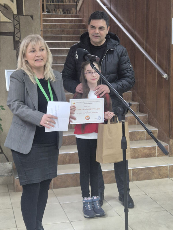 В Детския отдел наградите бяха в четири възрастови групи. Във възрастова група 3-4 клас с 215 прочетени книги отличена бе Невена Маркова от 3 клас на ОУ „Алеко Константинов“.