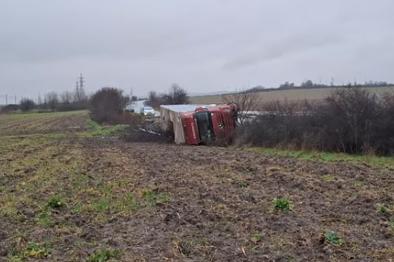 Камионът се е движил в посока Симеоновград. На десен завой шофьорът е загубил контрол, скъсал е мантинелата и е легнал на дясната си страна в крайпътната нива, съобщава „Сакар нюз“.