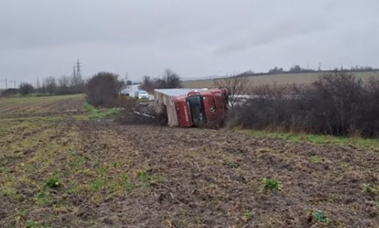 Камионът се е движил в посока Симеоновград. На десен завой шофьорът е загубил контрол, скъсал е мантинелата и е легнал на дясната си страна в крайпътната нива, съобщава „Сакар нюз“.
