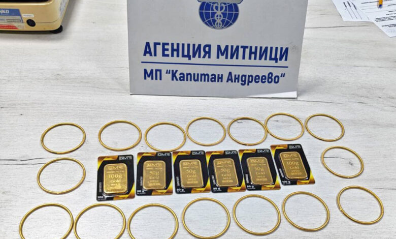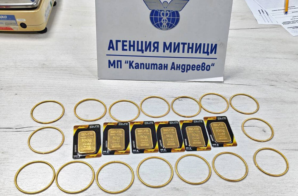 Недекларирани 400 грама златни кюлчета и над 830 грама златни накити задържаха митническите служители на ГКПП „Капитан Андреево“ при две отделни проверки на лек автомобил и автобус, влизащи в страната от Турция, съобщават от Агенция „Митници“.