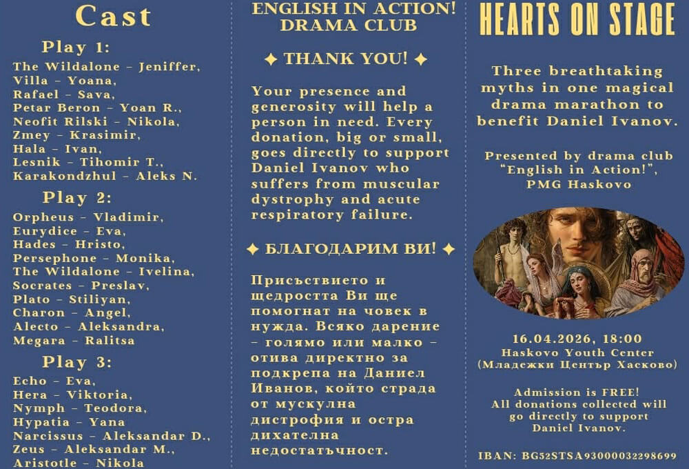 В артистичната проява ще се изявят талантите от театралния клуб „English in Action“ в ПМГ „Акад. Боян Петканчин“ в Хасково.