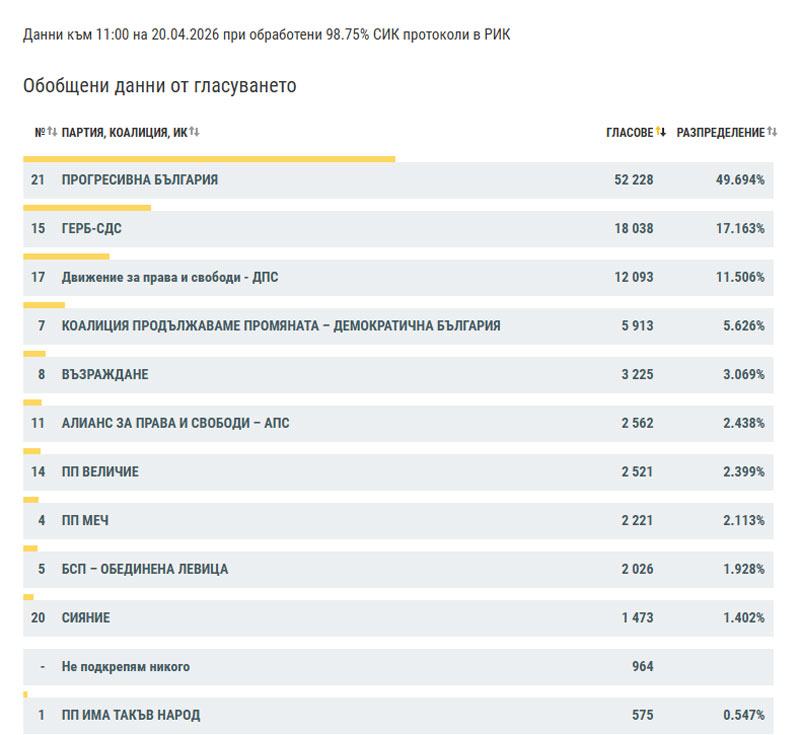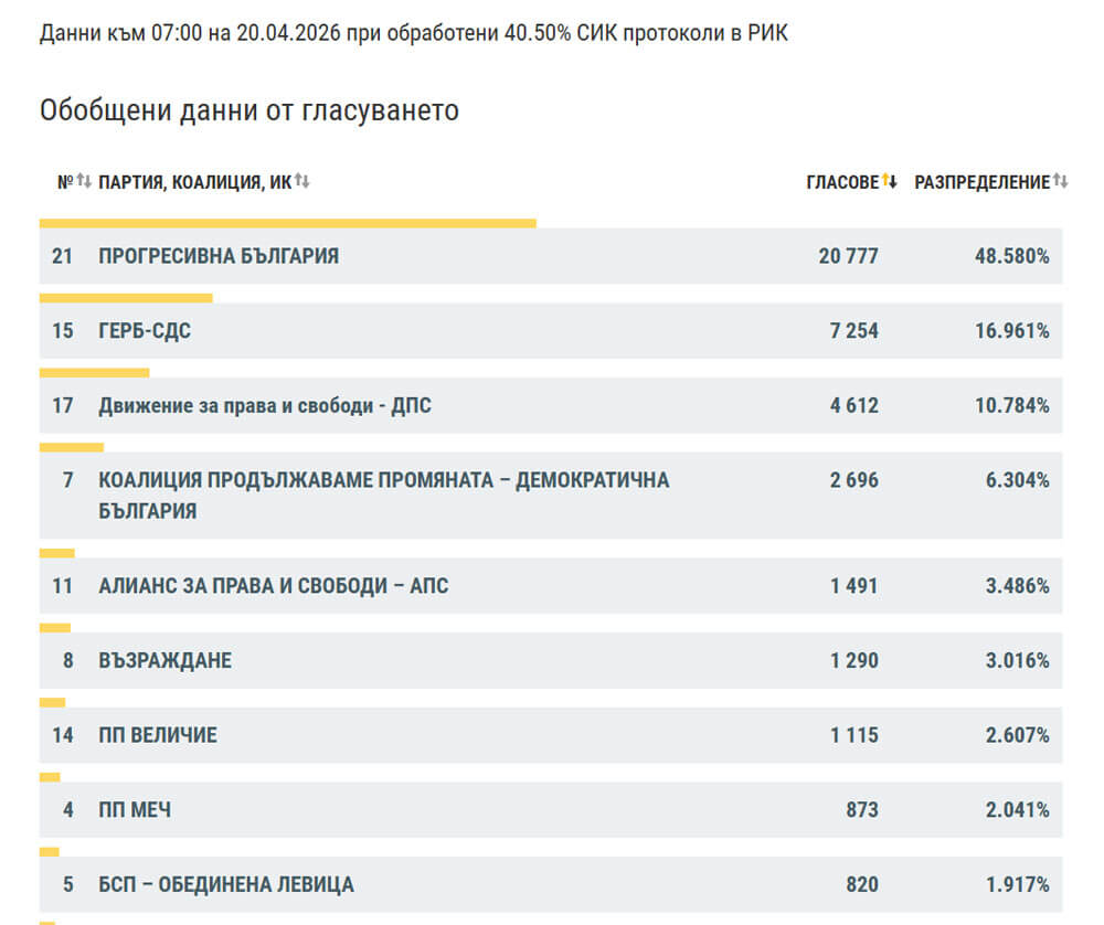Иначе при 40.50% обработени протоколи „Прогресивна България“ е първенец в областта с 20 777 гласа, или 48.58%, следвана от ГЕРБ-СДС – 7 254 гласа (16.9%), ДПС – 4 612 гласа (10.7%), ПП-ДБ – 2 696 гласа (6.3%), АПС – 1 491 гласа (3.4%), „Възраждане“ – 1 290 гласа (3%).