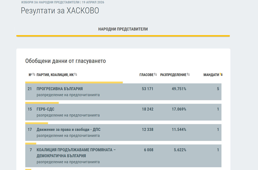 Окончателно след Избори 2026 в Хасково: 5 депутати за ПБ, по 1 за ГЕРБ, ДПС и ППДБ