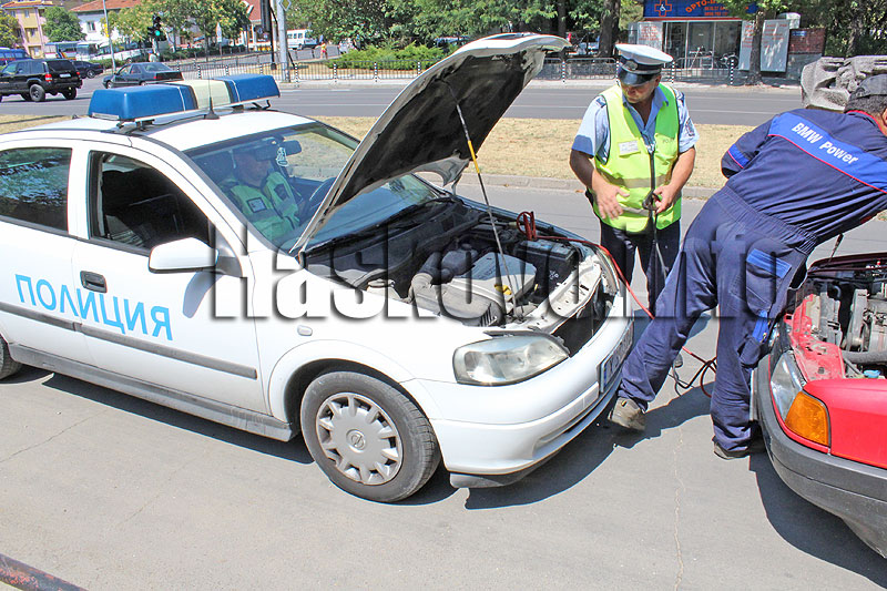 Явно жегата е дошла в повече на 16-годишния „Опел“, коментираха шофьори. В крайна сметка друга кола подаде ток към акумулатора на патрулката, която успешно запали и потегли.