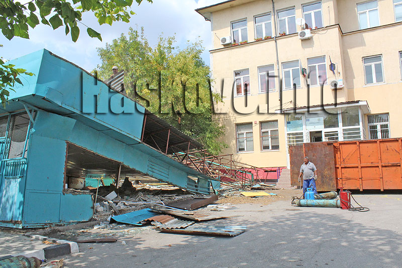Големият метален павилион за закуски до входа на хасковското Начално училище „Георги Сава Раковски“ се демонтира.